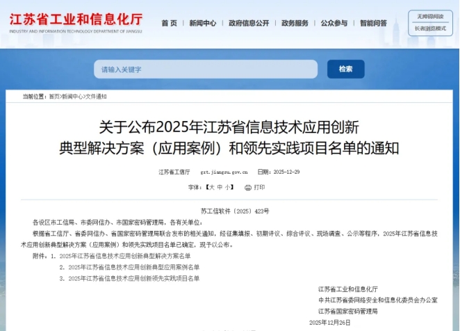 2025年12月26日,江蘇省工業(yè)和信息化廳、中共江蘇省委網(wǎng)絡安全和信息化委員會辦公室、江蘇省國家密碼管理局聯(lián)合發(fā)布“2025年江蘇省信息技術應用創(chuàng)新典型解決方案(應用案例)和領先實踐項目名單”。憑借創(chuàng)新的技術實力與扎實的業(yè)務支撐,新點軟件推出的“新點工程建設項目全生命周期數(shù)字化管理平臺解決方案”“新點e交易平臺解決方案”“新點軟件基于人工智能大模型技術的政務智能體解決方案”成功入選典型解決方案名單,再添三項榮譽。